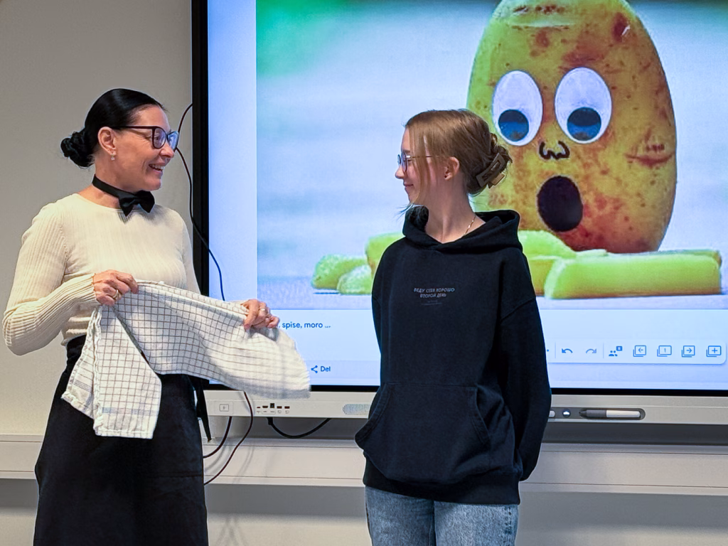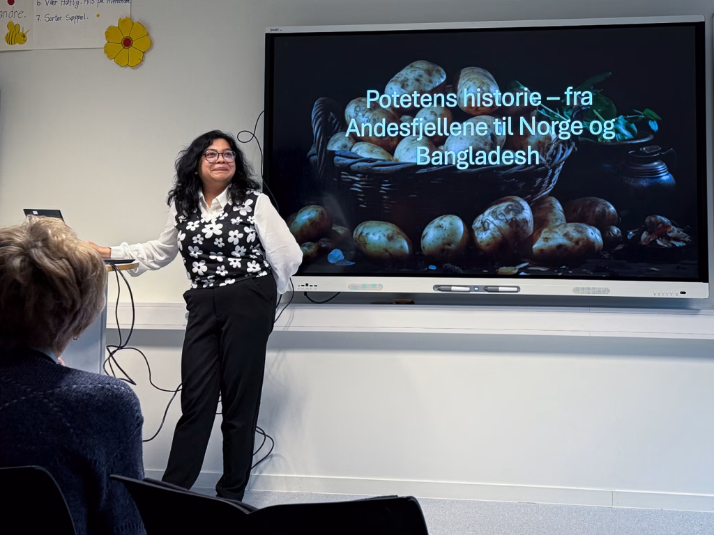 Noen uker senere fortsatte potetreisen i klasserommet sammen med elevene, lærere og samtalepartnere. Elevene presenterte fritt rundt tema potet, og resultatet ble et rikt språkopplæringsprosjekt med både historie, poesi, mat og musikk. Vi lærte om potetens vei fra Andesfjellene til norsk hverdagsmat, hørte en poetisk barnehistorie fra Iran omskrevet til norske forhold, fikk potetdikt på norsk og ukrainsk, og ble invitert på russisk «potetrestaurant» – komplett med smaker, oppskrifter og barndomsminner. Litt potetgull, smågodt og smaksprøver fra Iran hørte også med.