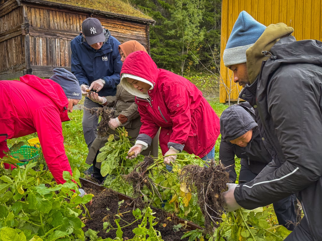 Sammen med en klasse fra voksenopplæringen – elever med røtter i mange land – plantet vi poteter om våren. I september høstet vi over 14 kilo! Vi vasket og veide dem ute, før vi delte fangsten likt. I Stabburet kokte vi småpoteter i havsaltvann, servert som en enkel smakebit.